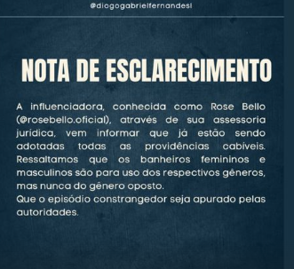 Ao fim da sessão, a influenciadora encontrou o homem na sala do cinema. Ao lado do marido, Rose aborda o rapaz para tirar satisfação, começa a gravar e questiona o motivo do rapaz ter entrado no banheiro feminino. Nas imagens, o homem, que preferiu não ser identificado, afirma que estava apertado e que não viu a placa do banheiro feminino. Ademais, ao perceber, ele teria saído do local imediatamente.