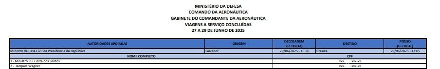 De acordo com informações do Comando da Aeronáutica, ligado ao Ministério da Defesa, o voo que transportou Rui Costa e Jaques Wagner partiu de Salvador às 15h30 do próprio domingo (29) pousando em Brasília por volta das 17h05. Não havia nenhum outro passageiro registrado a bordo da aeronave.