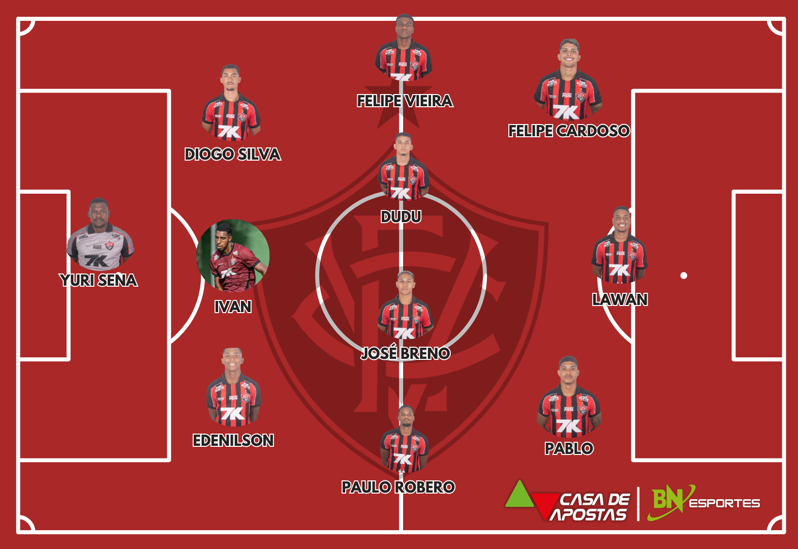 Vitória: Yuri Sena; Edenilson, Ivan e Diogo Silva; Paulo Roberto, José Breno, Dudu e Felipe Vieira; Pablo, Felipe Cardoso e Lawan. Técnico: Rodrigo Chagas.