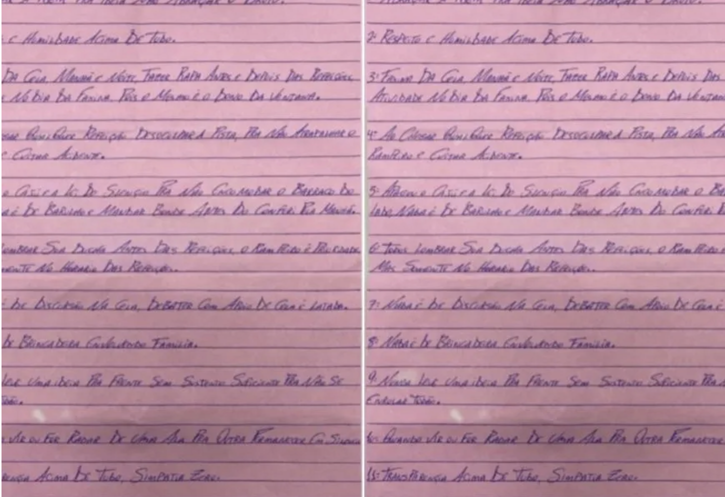 O papel, descrito pelas autoridades como um manual de conduta, estabelece regras e punições para integrantes do grupo no interior da unidade. Entre as normas listadas estão a "proibição de roubo dentro do pavilhão", o "respeito obrigatório entre integrantes", com a ressalva de que "brigas somente [devem ocorrer] com autorização", e a exigência de "silêncio após horário determinado", prevendo punições para quem descumprir.
