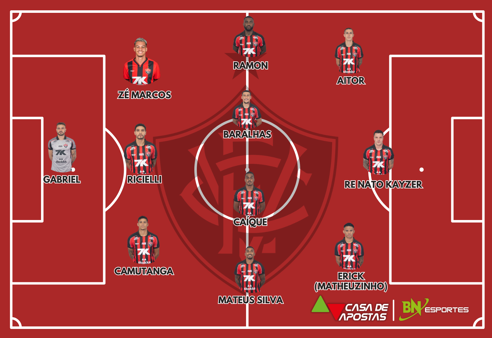 Vitória: Gabriel; Ricielli, Camutanga e Zé Marcos; Mateus Silva, Baralhas, Caíque e Ramon; Aitor, Erick (Matheuzinho) e Renato Kayzer. Técnico: Jair Ventura.